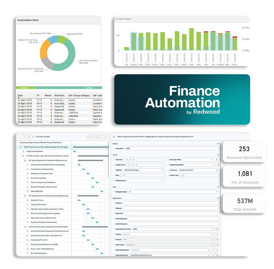 Finance Automation by Redwood eliminates manual processes across the record-to-report (R2R) workflow by automating SAP transactions, calculations, validations, journal entries and postings. It orchestrates each step automatically as prerequisites are met and advances the month-end close without your accounting team needing to intervene, which helps teams optimize resources across the financial close process.