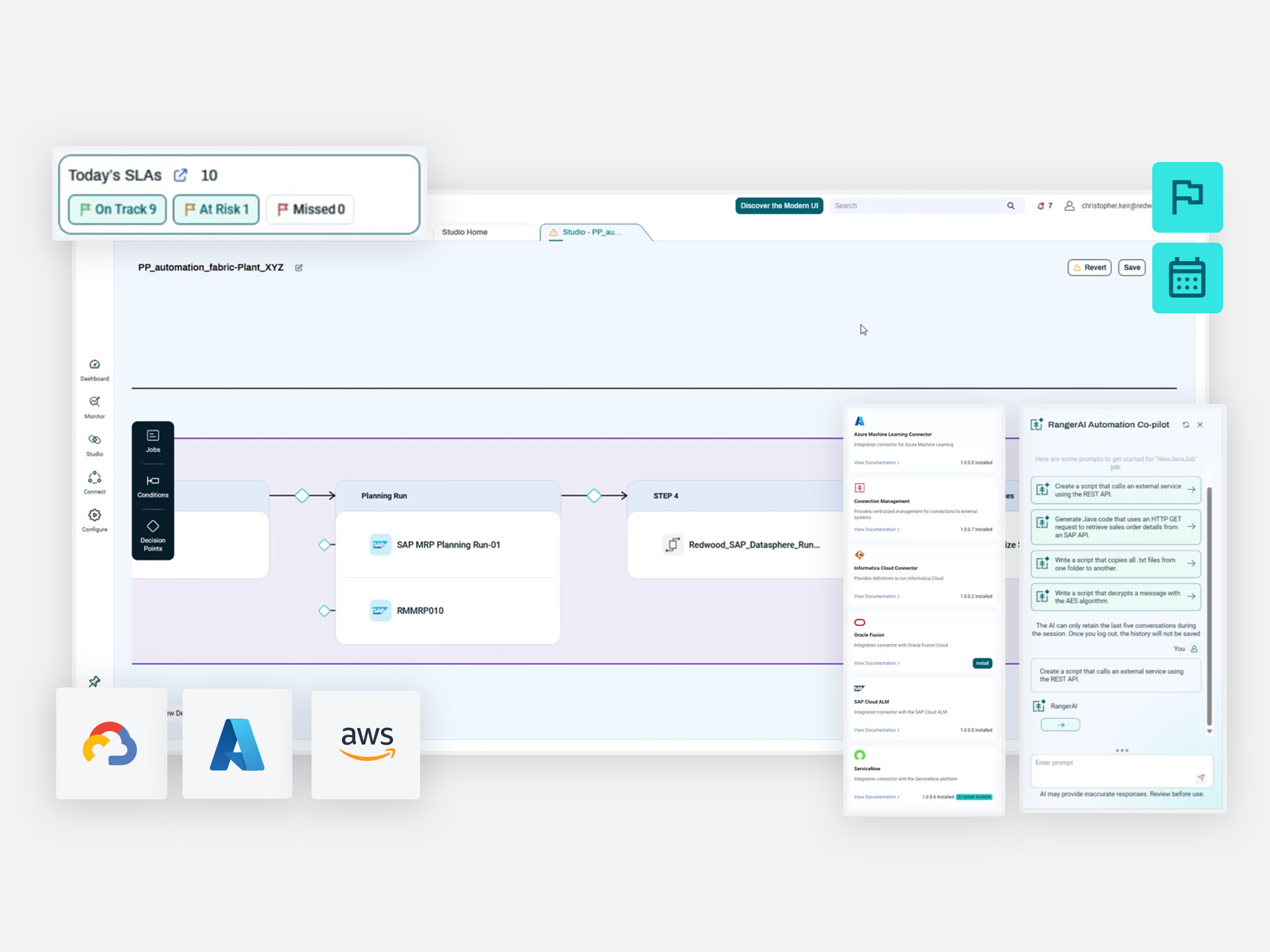 AI is embedded at every stage, from workflow design assistance and performance and anomaly detection to predictive SLA monitoring and automated remediation. Redwood RangerAI and Redwood Insights give teams proactive control before incidents reach production.